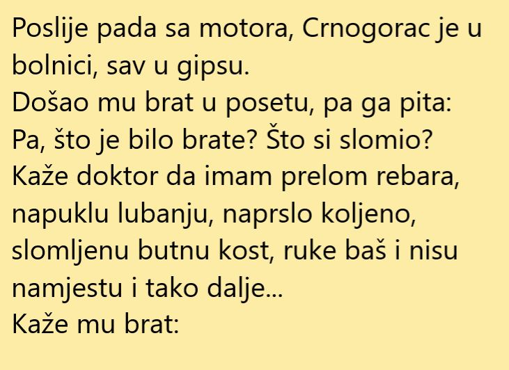 Jedan Crnogorac je pao s motora i dosta se polomio. No ipak je uspio preživjeti ali teško se povrijedio. Kada mu je brat došao u bolnicu da ga obiđe, šokirao se. Evo šta mu je povrijeđeni brat rekao o svojim povredama. Za kraj donosimo malo ozbiljniji tekst o posljedicama pada s motora i šta učiniti da to spriječimo.