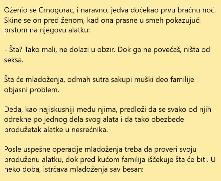 Za današnju priču imamo jednu šaljivu temu a radi se o Crnogorcu koji je se tek oženio. Njegova draga je imala primjedbe na veličinu njegovog alata, bio joj je premali i tražil je da ga poveća. Kako je porodica odlučila da se solidariše i svi da pomognu, detaljnije u nastavku članka.
