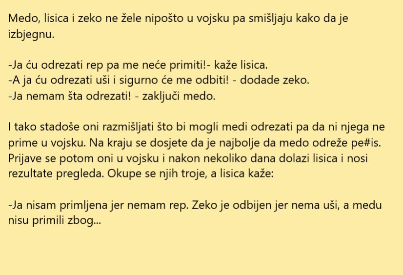 U ovoj priči imamo životinje koje oponašaju ljudske osobine, pa tako imamo medu, zeku i lisicu. Dobili su pozive za služenje vojnog roka ali su željeli da to izbjenu. Lisica je inicirala da smisle plan kako da izbjegnu vojsku i evo čega su se dosjetili. Na kraju je medo izvukao najdeblji kraj.