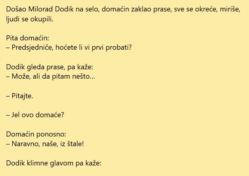 Milorad Dodik je jedan od najkontroverznijih političara sa ovih krajeva. Ono što ga definiše jeste politička dugovječnost, bahate i kontroverzne izjave i stavovi, kao i njegov desničarski narativ i dizanje međunacionalnih tenzija. Danas donosimo jednu šaljivu priču o njemu jer kako drugačije nasmijati ljude, slijedi šaljiva priča a zatim jedan osvrt o Miloradu Dodiku kao političaru.