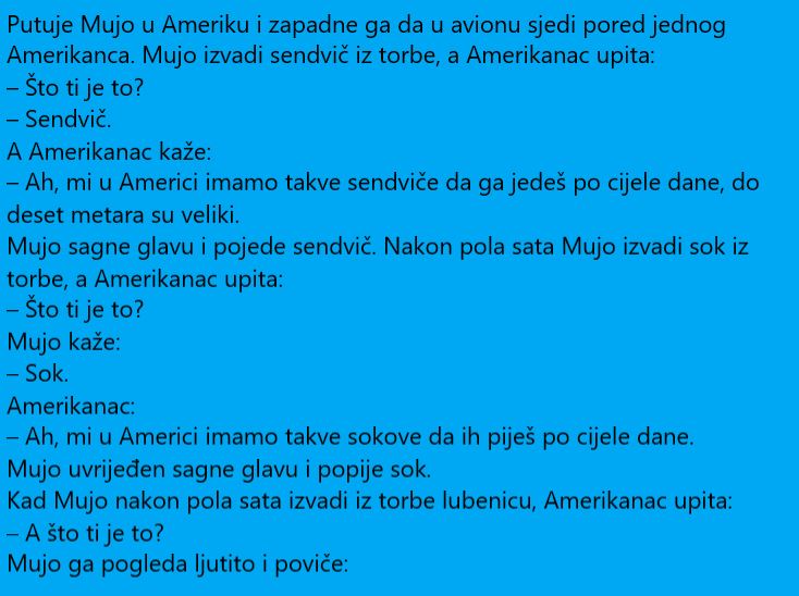 Ovaj razgovor desio se na letu za Ameriku. Naime, Mujo iz bosne letio je za Ameriku i na tom letu razgovarao je s jednim nadobudnim Amerikancem. Imao je neku hranu i krenuo da jede ali mu je Amerikanac smetao sa svojim podrugljivim komentarima. No, Mujo se dosjetio kako da preokrene ovaj razgovor u svoju korist.