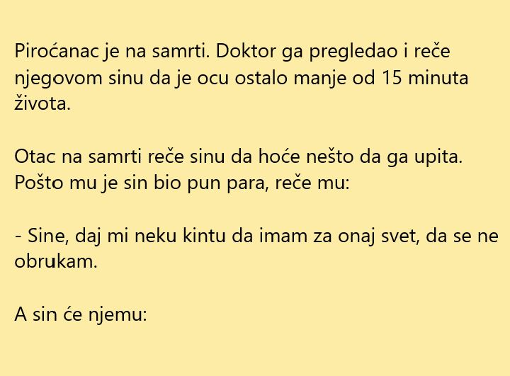 U ovom članku imamo jednu nesvakidašnju duovitu priču, koja na satiričan način prikazuje škrtost Piroćanaca. Naime, otac je bio na samrti i imao je jedan neobičan zahtjev od sina. No njegov odgovor je bio još neobičniji i iznenadio je sve prisutne.