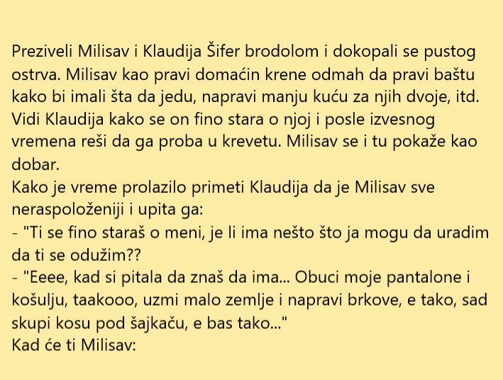 U ovoj današnjoj priči imamo dvoje, muško i žensko, Milisav i Klaudija Šifer koji su preživjeli brodolom i uspjeli se nekkao dokopati pustog ostrva. Nakon nekog vremena zbližili su se i Klaudija je odlučila da oproba Milisava u onim stvarima. Nakon obavljenog posla, Milisav je imao jedan čudan zahtjev a detaljnije ćemo u priči objasniti.