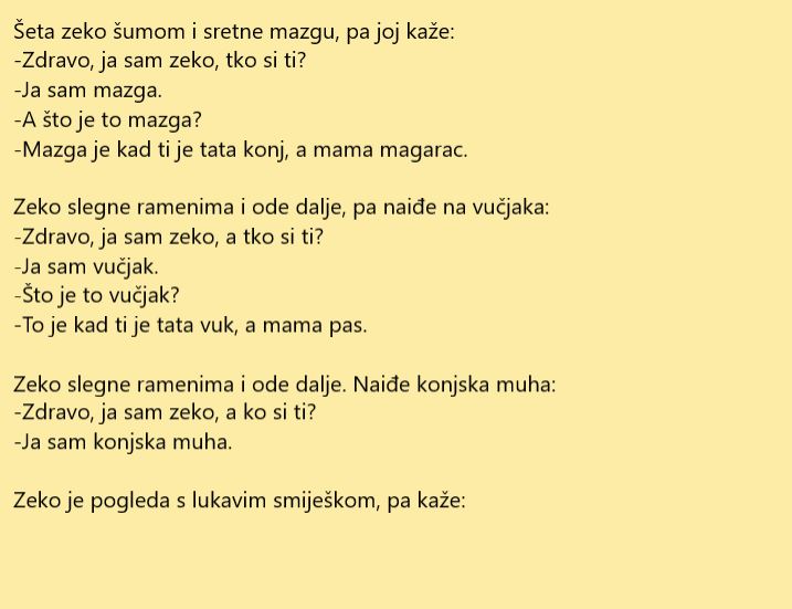 Ova priča je u suštini jedna basna gdje životinje poprimaju ljudske osobine i mogu da pričaju. U današnjoj priči imamo glavnog junaka, zeku koji je šetao šumom i sretao razne živoinje. Nije znao ko su te životinje pa ih je pitao. Kada je došao do konjske muhe, njen odgovor ga je nasmijao od srca.